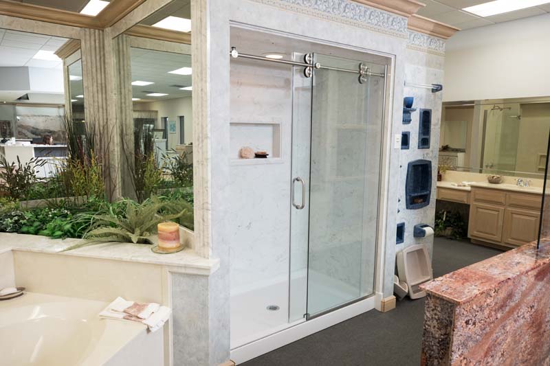 Visit our showroom to see custom vignettes of shower surrounds, whirlpool tubs and surrounds, custom glass enclosures, kitchen counter top options, and more. While you’re here, be sure to speak with one of our friendly and knowledgeable sales representatives and set up an appointment for a free estimate.